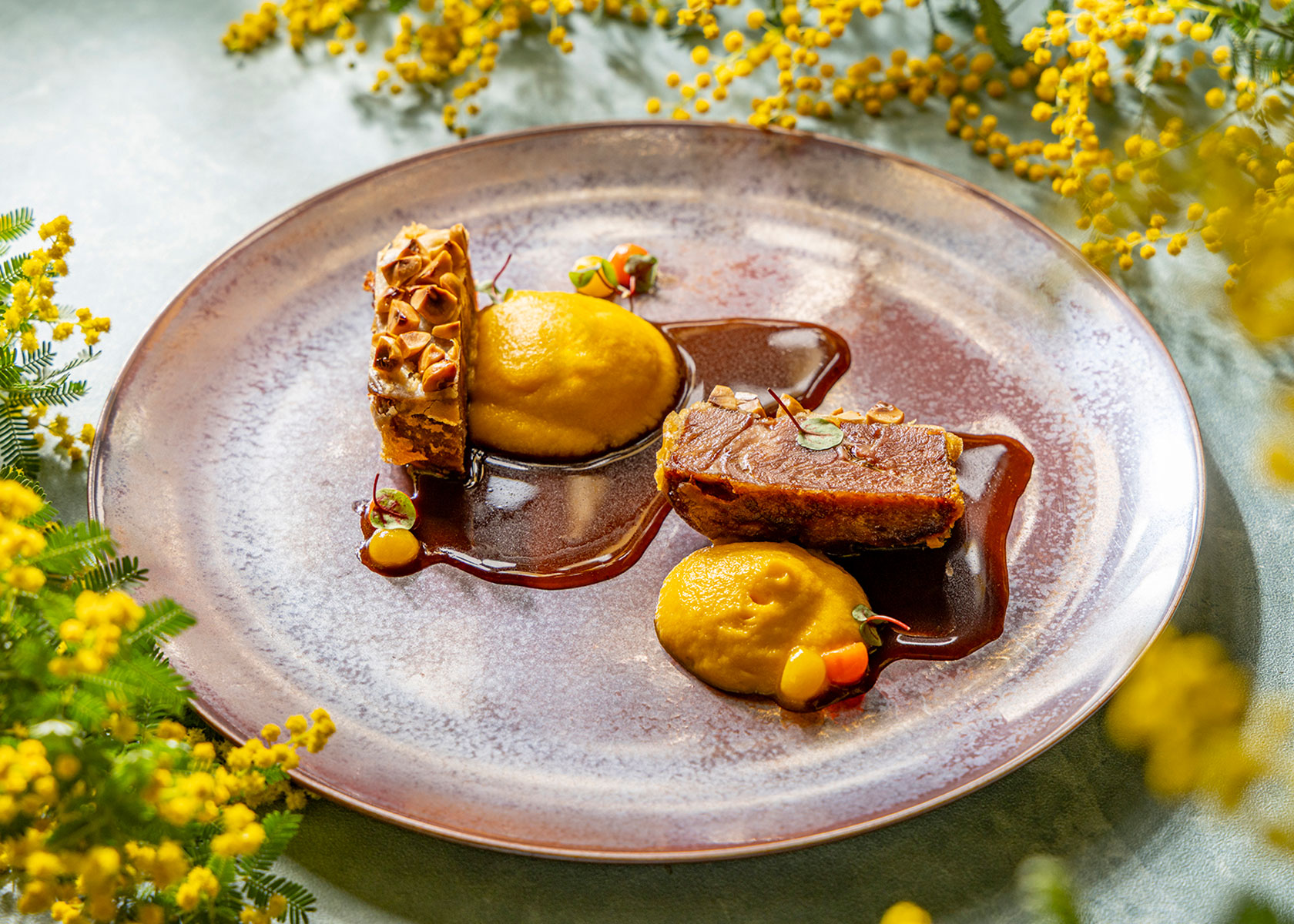 健康的に育ったオージー・ラムを、じっくりとコンフィし、しっとりと仕上げ。香ばしく砕いたヘーゼルナッツをまとわせてベニエにすることで、ラム肉本来の旨みとナッツの芳醇な香りや食感を重ねた一品。