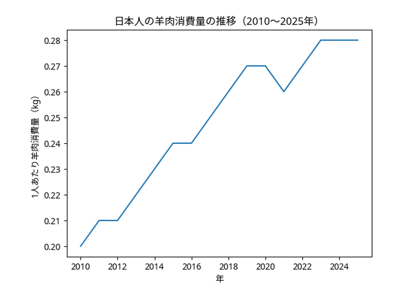 日本人一人あたりの羊肉消費量は、年間約0.28kg前後(約280g)2010年代前半には約0.2kg前後だったことを考えると、この10年ほどで約1.4倍に増加しています。まだ他の肉に比べると少ない数字ですが、裏を返すとこれから伸びる余地が大きい市場!!という事が出来ます。